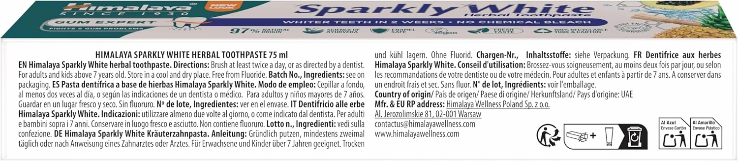 Избелваща паста за зъби без флуорид SPARKLY WHITE, Himalaya, 75 ml